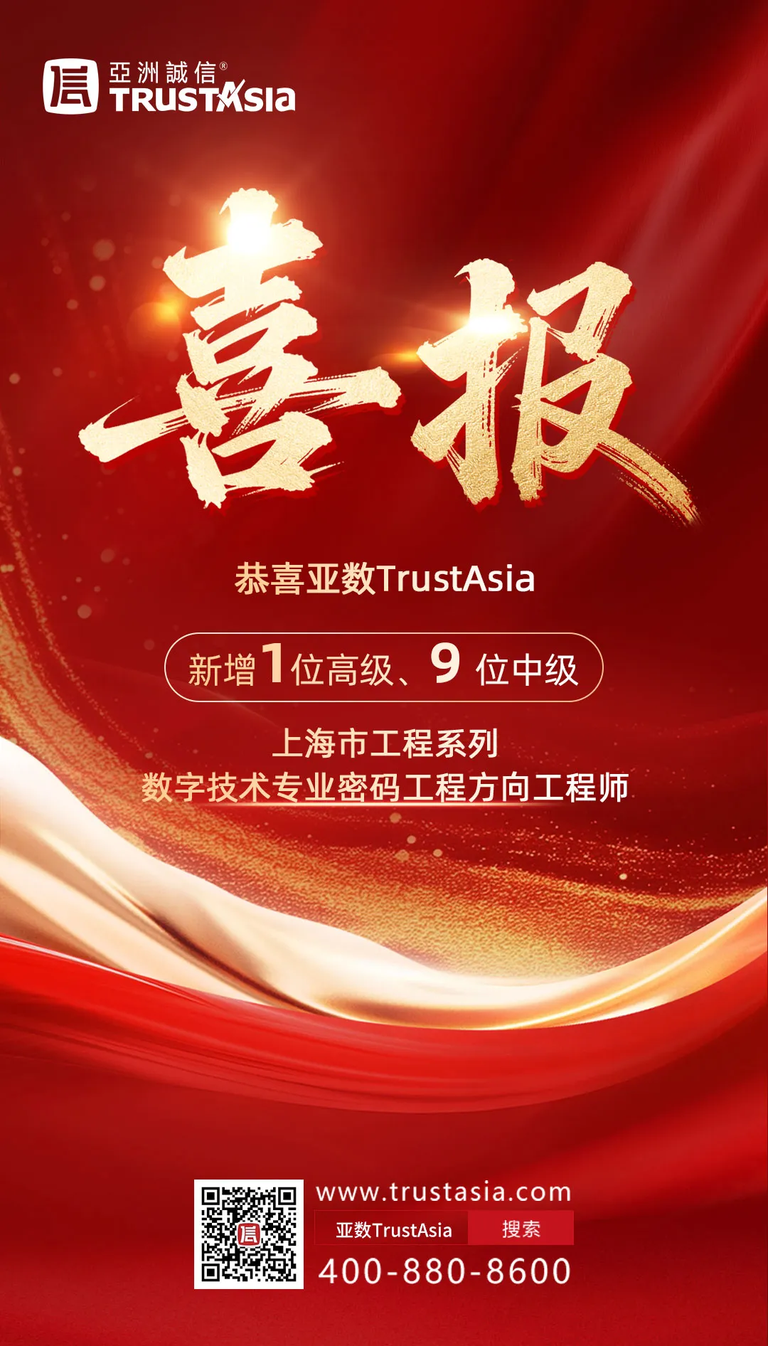 在首届上海市工程系列数字技术专业密码工程方向工程师职称评审中,亚数信息科技(上海)有限公司(以下简称“亚数 TrustAsia”)取得重要成果——公司 CEO 翟新元成功获评“上海市工程系列数字技术专业密码工程方向工程师高级职称”,同时另有9位技术骨干顺利通过“上海市工程系列数字技术专业密码工程方向工程师中级职称”评审。