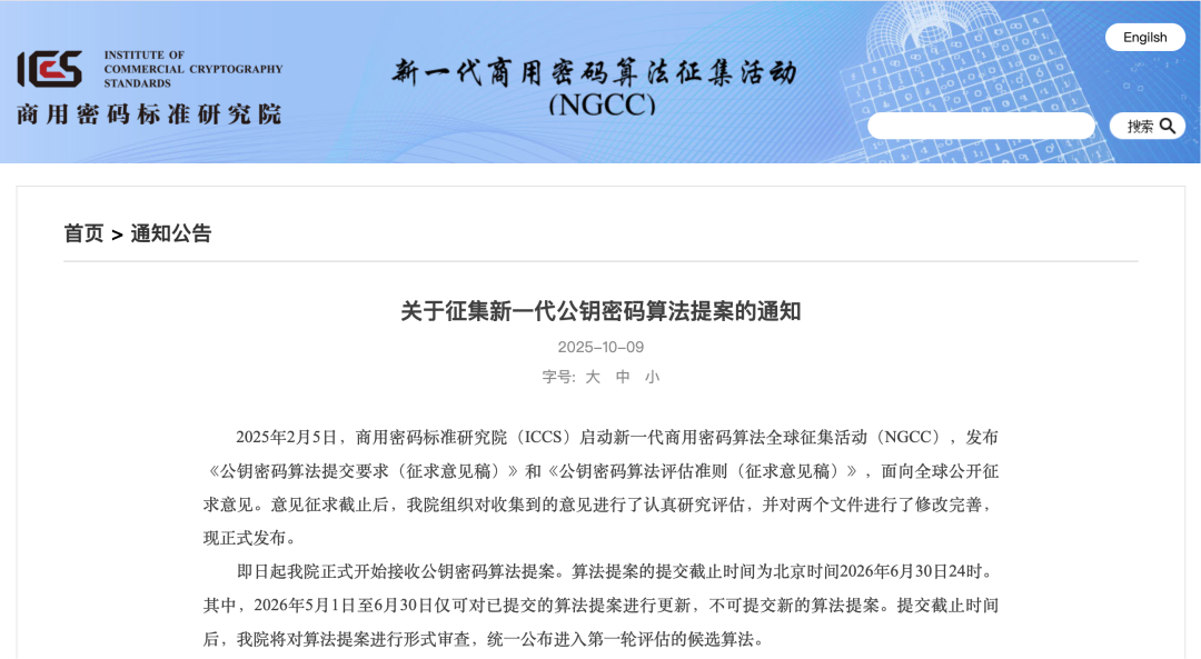 我国高度重视商用密码的发展与应用,先后提出了 SM2、SM3、SM4 等多项商用密码算法,并在后量子密码时代持续推进算法研发、标准制定等工作。如 2025 年 2 月,商用密码标准研究院面向全球公开征集新一代商用密码算法,覆盖公钥、杂凑、分组密码等方向;同年 10 月,又进一步启动新一代公钥密码算法征集,为我国抗量子密码技术的标准化与应用落地提供有力支撑。