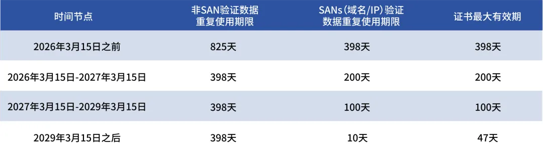 如果你还不清楚,政策是这样的——2025 年 4 月,CA/B 论坛一致通过了 SC-081v3 提案,为 TLS/SSL 证书的有效期划下了三条不可逆转的“生死线”: