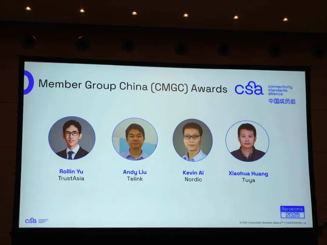 这一成就离不开 CMGC 成员们的专业投入与持续贡献。在此次评选中,亚数信息科技(上海)有限公司(以下简称“亚数TrustAsia”)的CTO余宁(Rollin Yu)与来自泰凌微电子(Telink)的刘杰(Andy Liu)、诺迪克半导体(Nordic)的艾敏华(Kevin AI)及涂鸦智能(Tuya)的黄小华(Xiaohua Huang)共同荣膺「CMGC 2025年度贡献奖」。