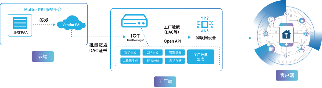 借助 IoT TrustManager软硬件一体设备,为 Matter 设备量产提供密钥、工厂数据及二维码的安全生成与烧录管理,显著提升生产安全与效率。